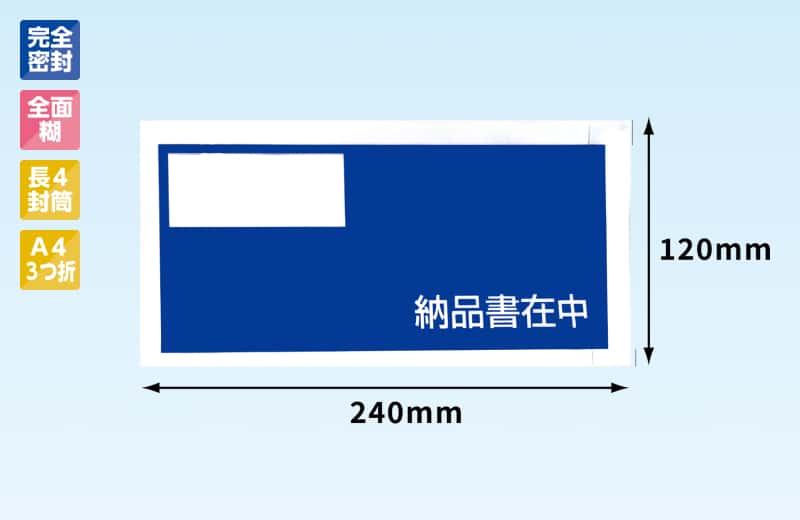 完全密封タイプ 全面糊青(白地)印刷 納品書在中 透明窓付長4封筒(A4 3つ折)サイズ用120mm×240mm